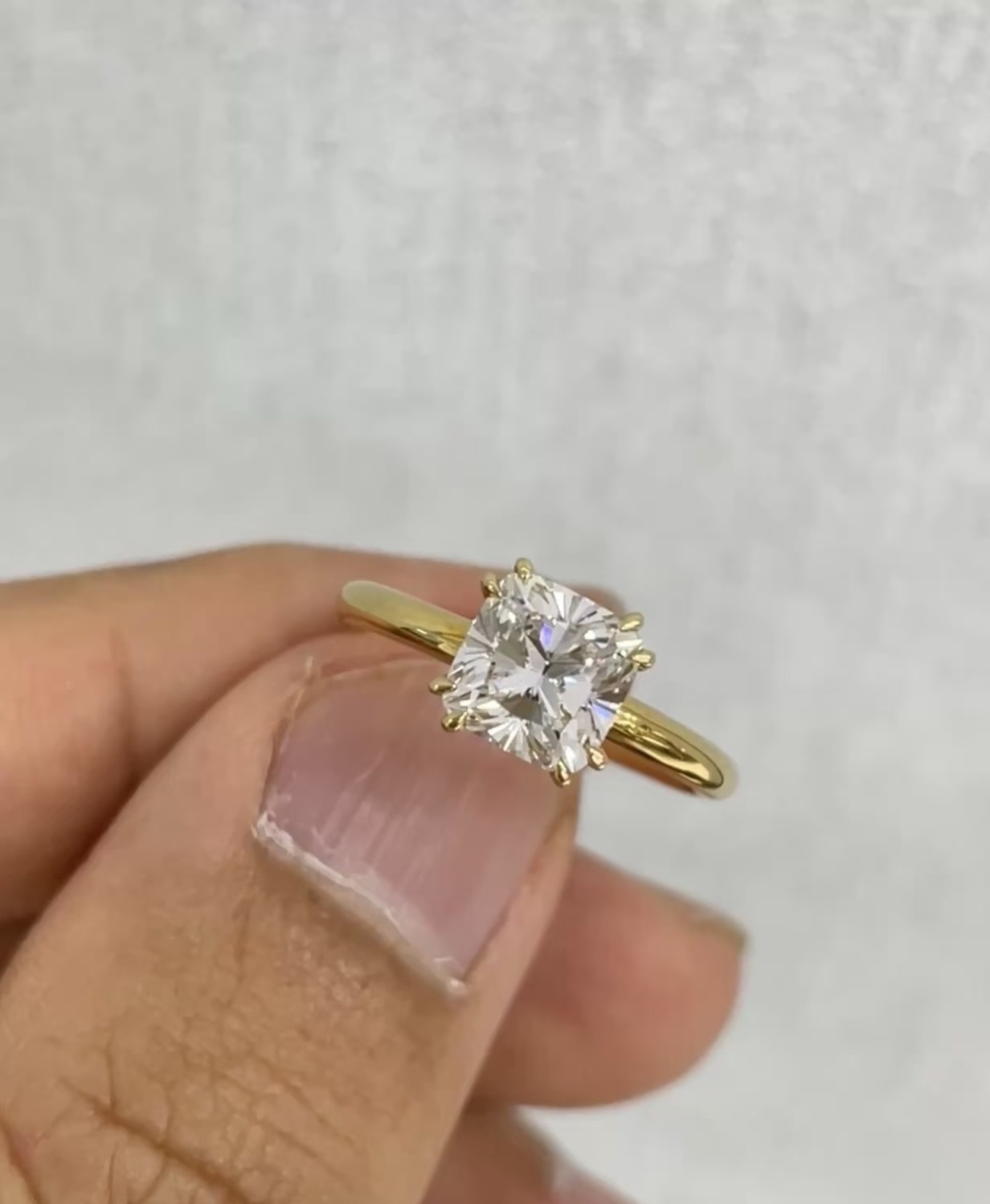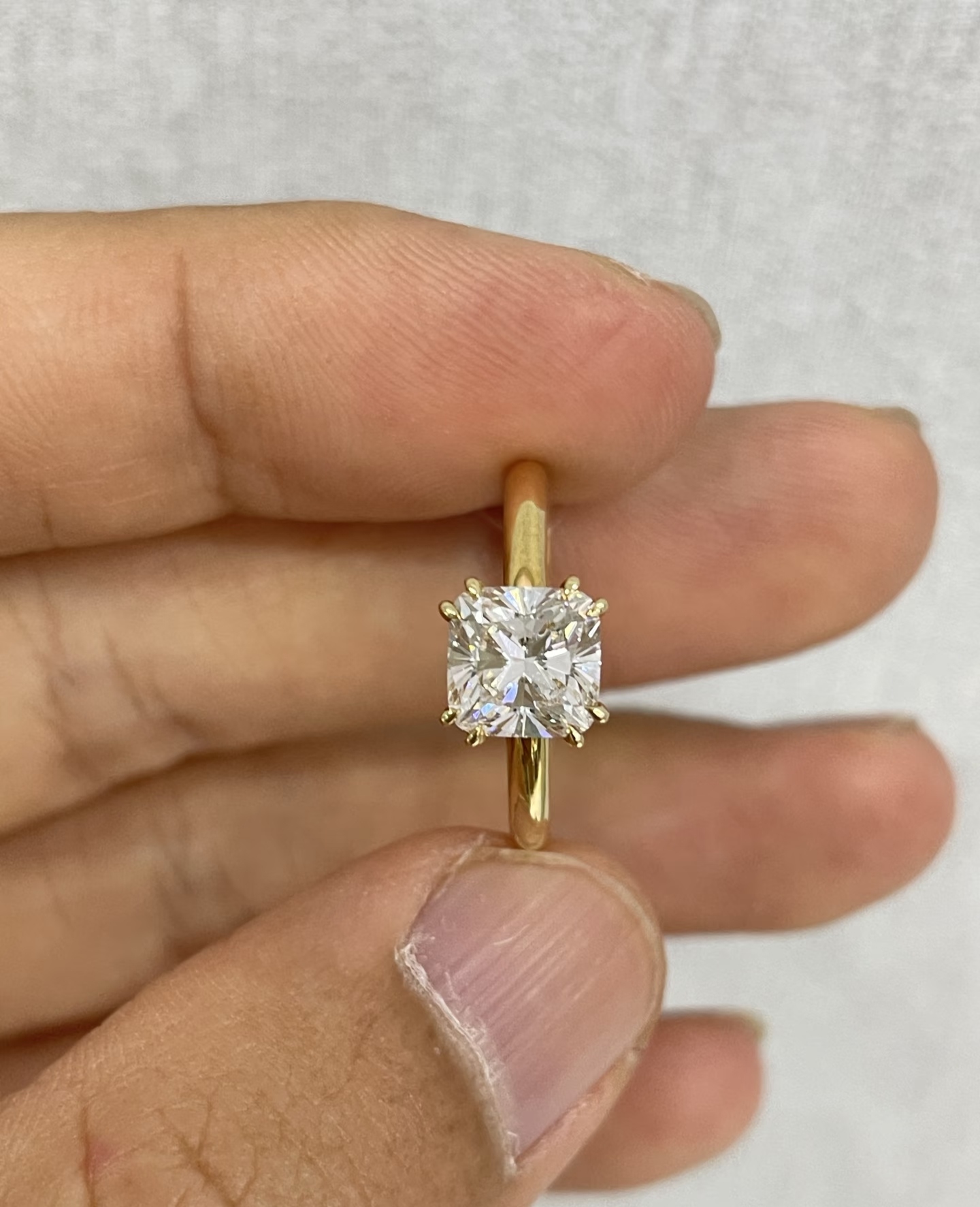 Crafted in polished 14K/18K yellow gold, this stunning solitaire ring centers on a 1.34-carat cushion-cut lab-grown diamond (Color: E, Clarity: VS2), secured by an elegant eight-prong setting. Designed to maximize the stone’s natural brilliance, it balances timeless sophistication with modern minimalism.