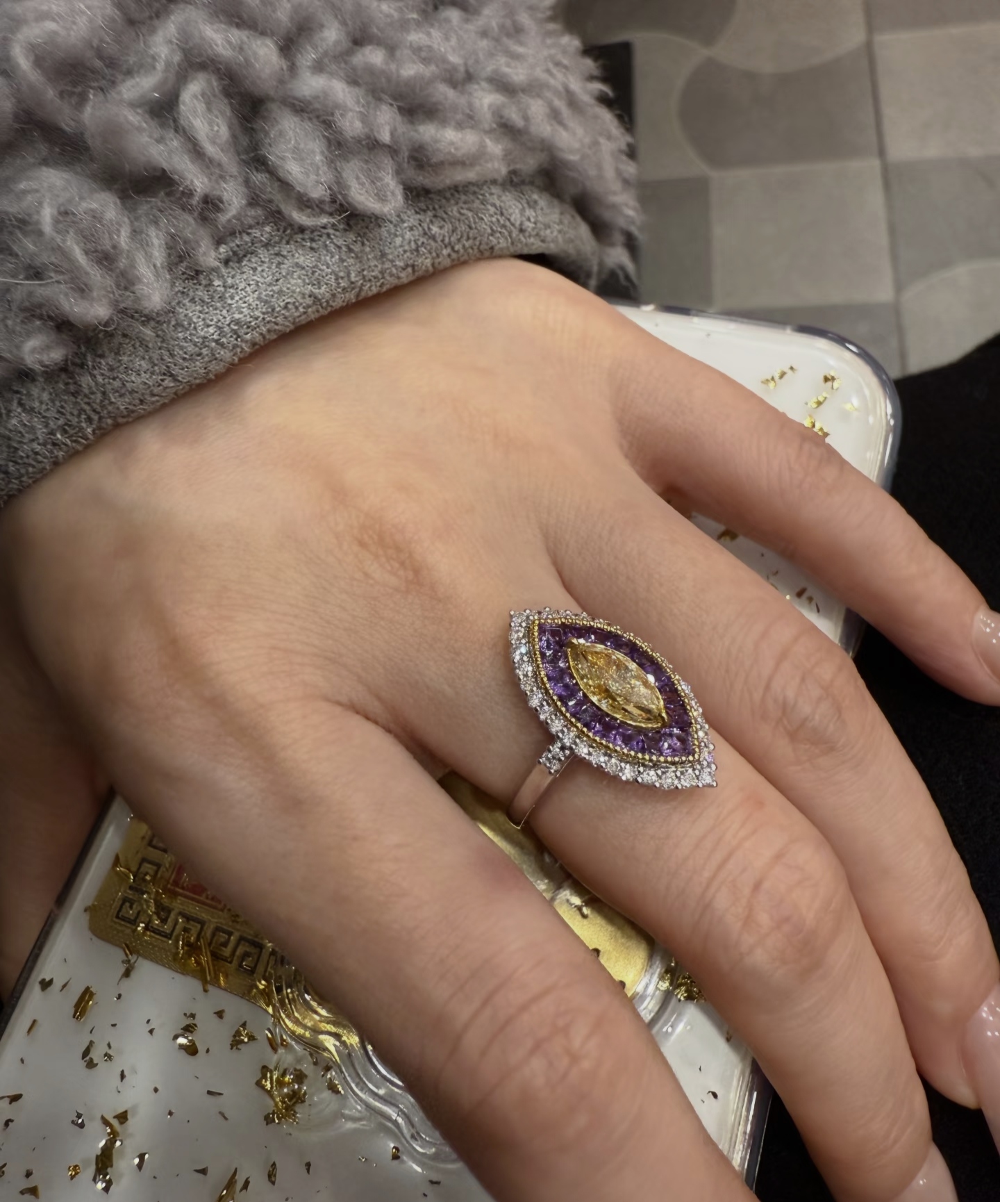 Navette Halo Design: The iconic marquise (navette) silhouette is amplified by a layered halo, with the center fancy yellow diamond, amethyst middle layer, and white diamond outer border creating a dramatic, eye-catching focal point.
