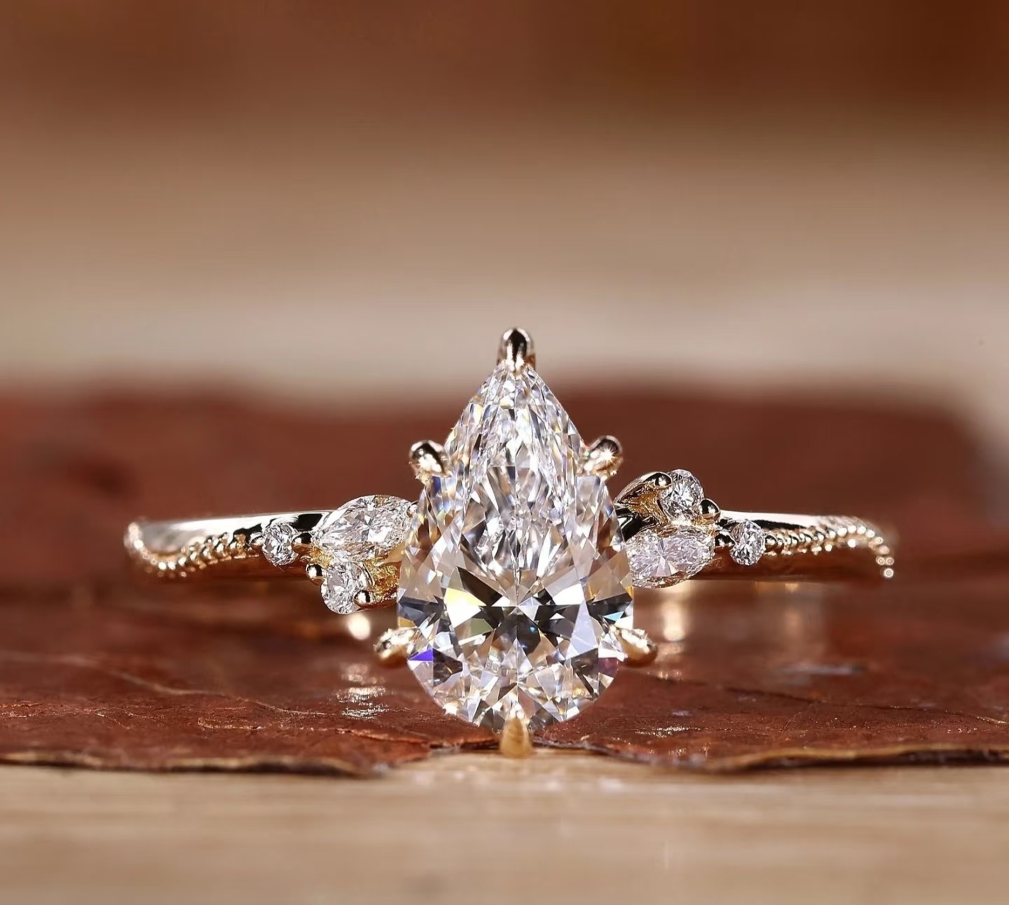 Vintage Milgrain Band: The band features intricate milgrain detailing along the edges, adding a romantic, antique-inspired texture. Delicate pear and round accent diamonds flank the center stone, creating a balanced, symmetrical design that enhances the main diamond’s presence without distraction.