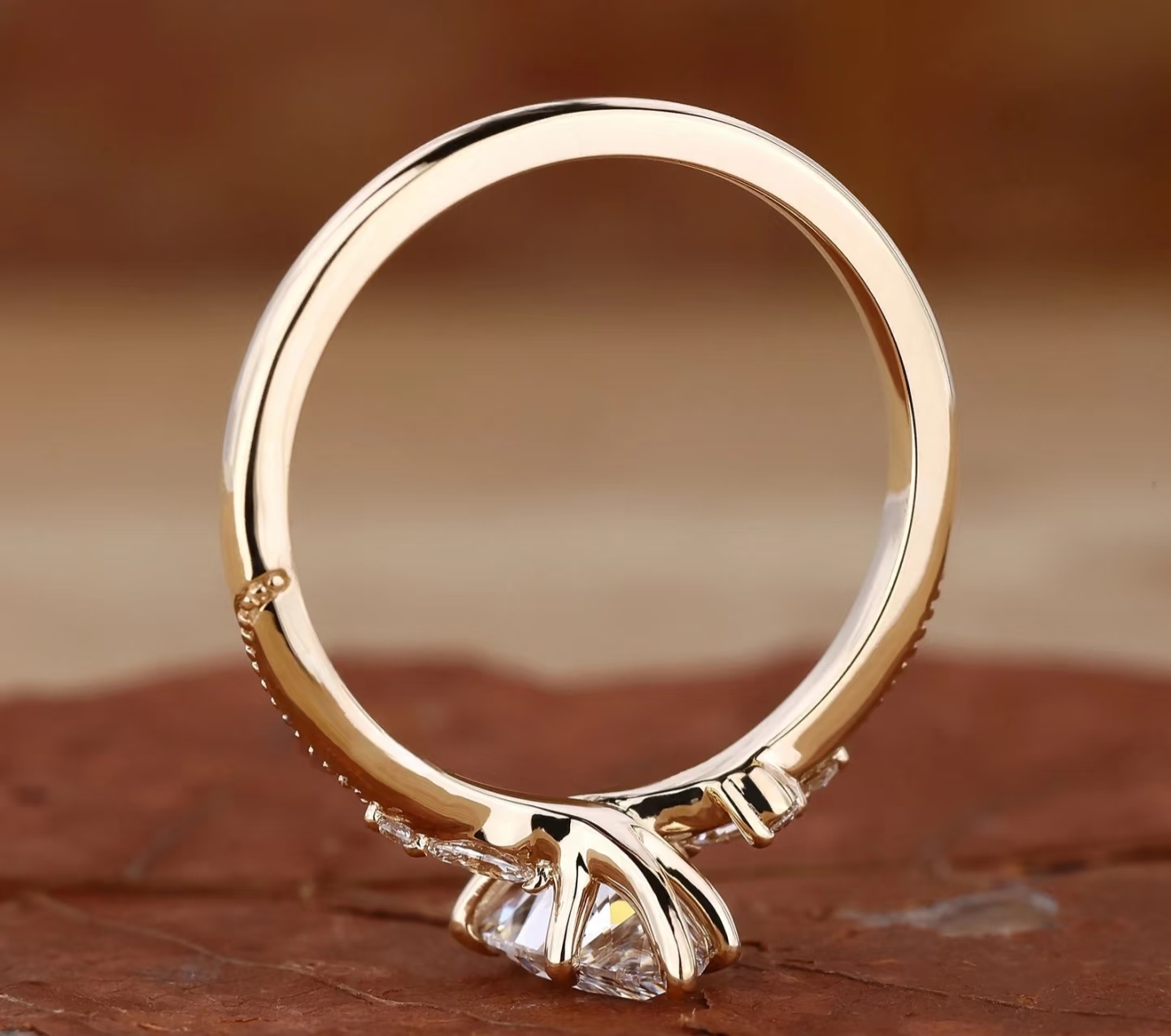 Secure Prong Setting: A refined 6-prong setting securely cradles the pear diamond, minimizing metal obstruction to allow maximum light penetration, showcasing the stone’s full brilliance from every angle.