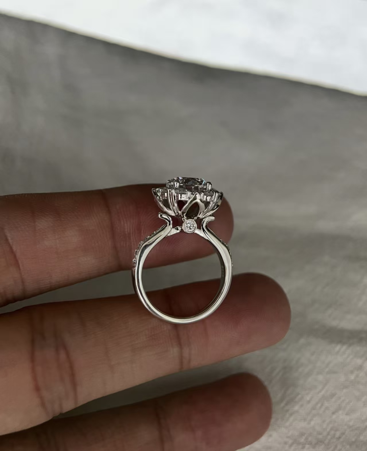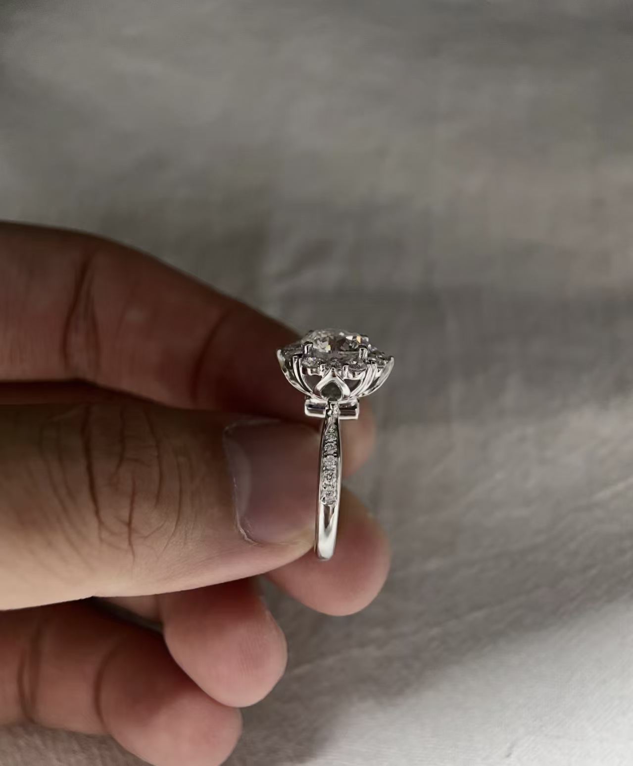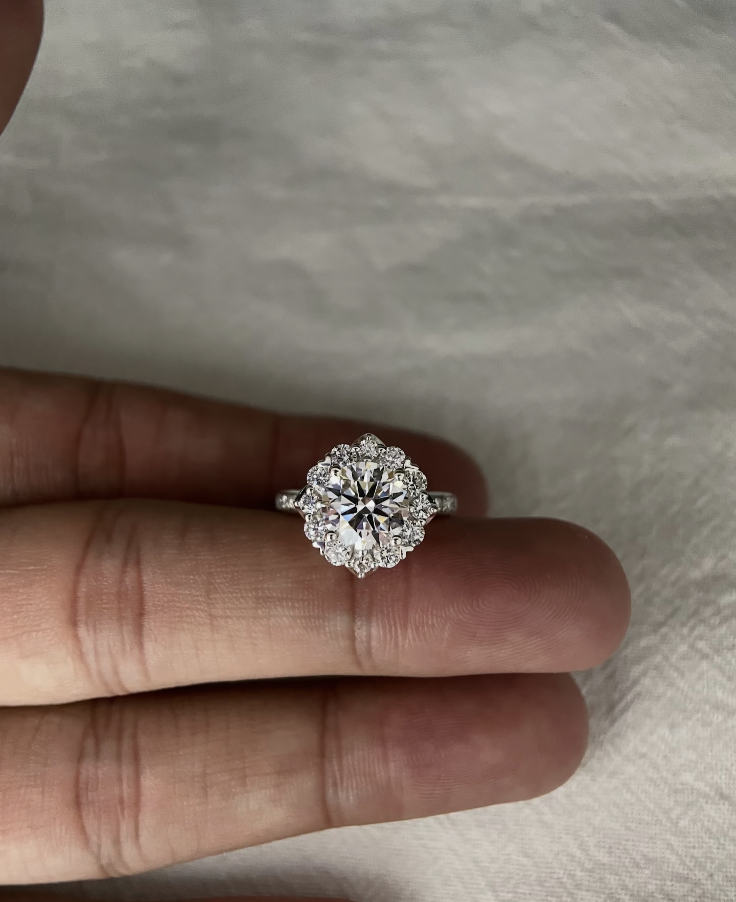 - The Sunflower Halo: Delicate, precision-cut accent diamonds form a blooming floral frame, enhancing the center stone’s size and shine while adding a soft, romantic touch.