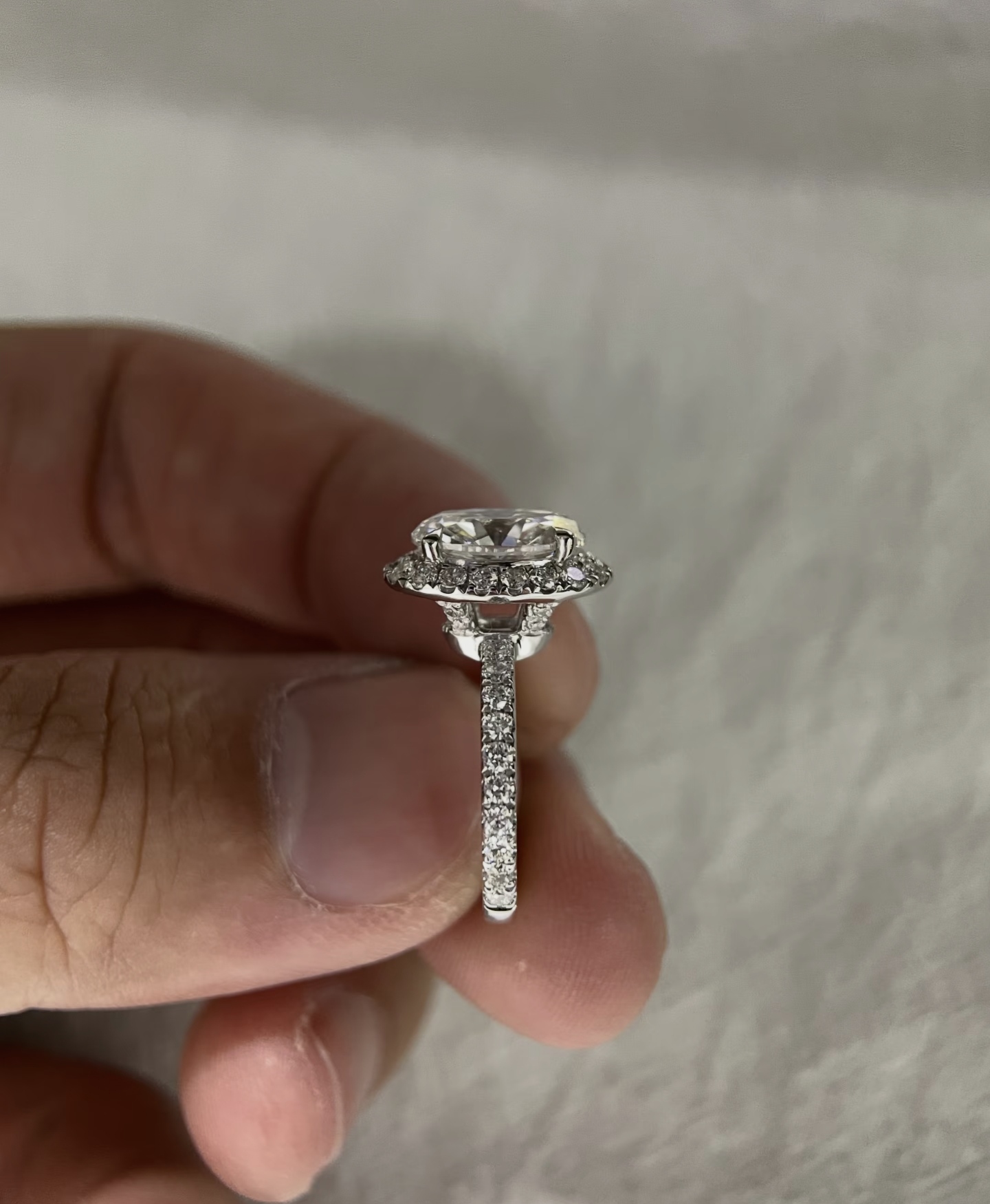 The ring features a full pavé hidden halo design: Unlike a traditional solitaire, this intricate halo of micro-pavé diamonds encircles the center stone, making the 3-carat main stone appear visually larger and more luminous. The diamond is secured by a sleek, low-profile setting that maximizes light exposure to enhance its brilliant fire.