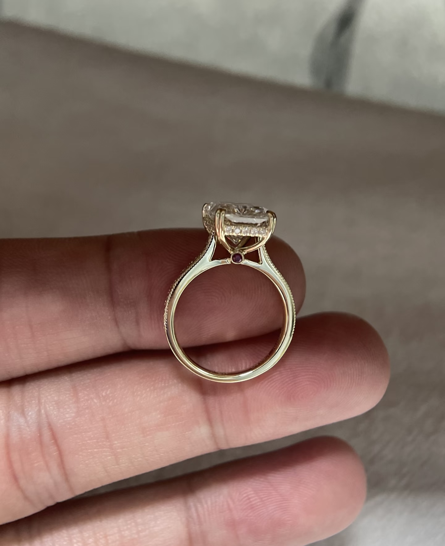 The ring showcases a secure four-prong setting that maximizes light exposure to the center stone, highlighting the radiant cut’s unique geometric sparkle. The standout feature is the milgrain detailing on the band shoulders—tiny beaded edges that create a vintage, hand-crafted aesthetic.
